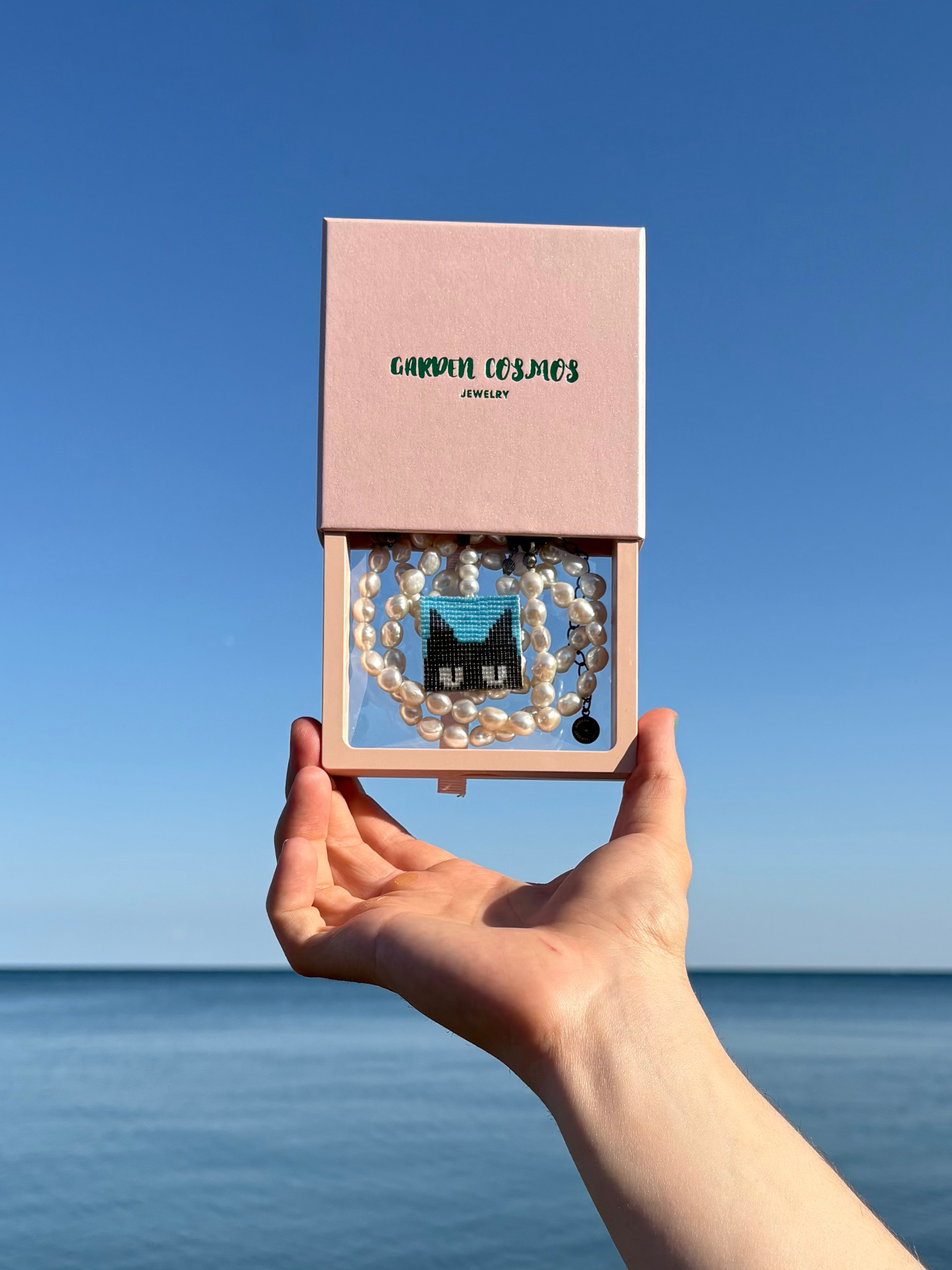 Hand-crafted pearl necklace with beaded grey & blue cat pendant. Ideal to give an elegant, yet fun and unique touch to your looks.